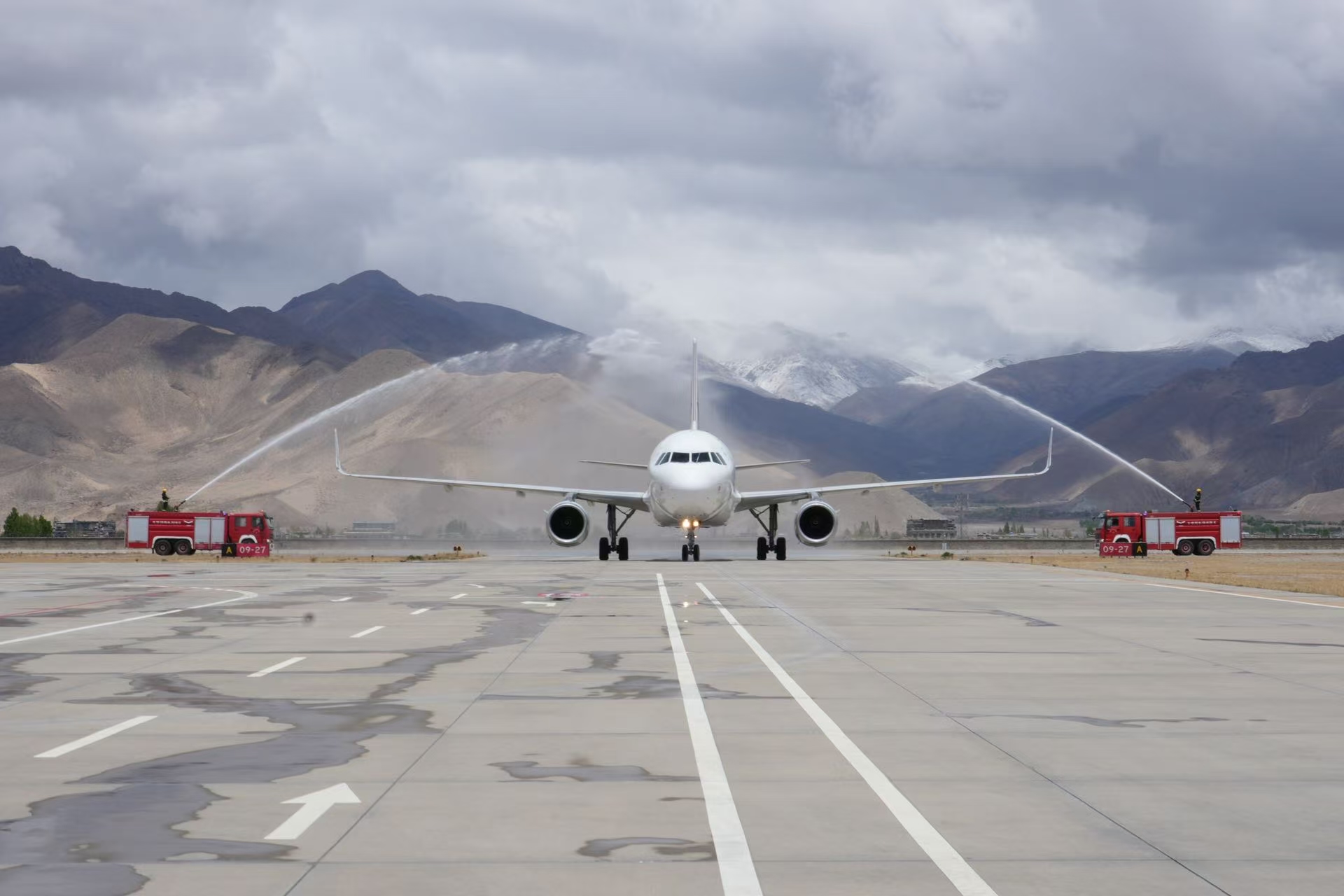 2025年5月1日,中國東航開通首條上海直飛日喀則的航線,該航線成為西藏支線機(jī)場(chǎng)連接上海的第一條直達(dá)空中通道,圖為日喀則機(jī)場(chǎng)以“水門儀式”迎接首航航班。