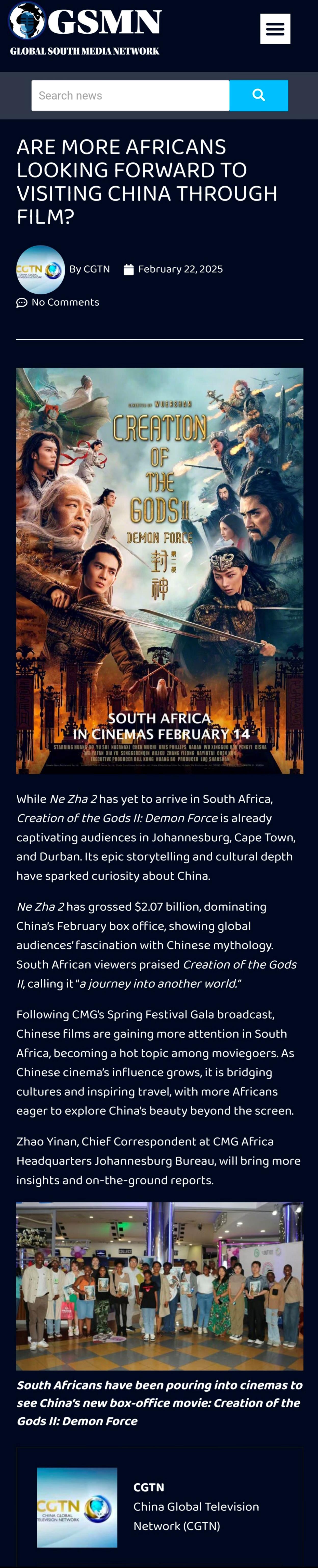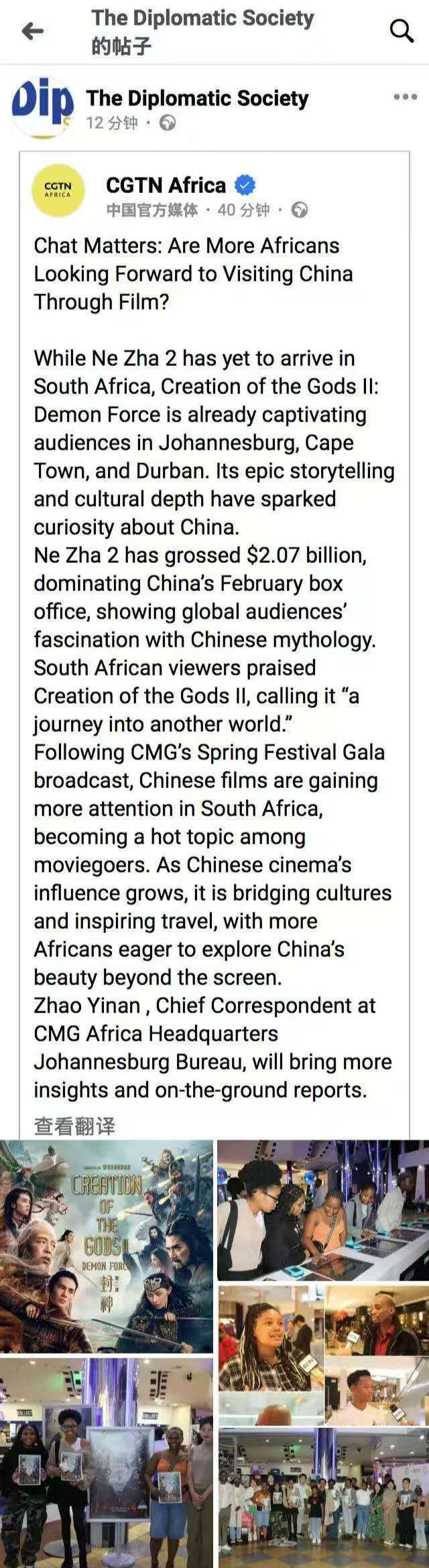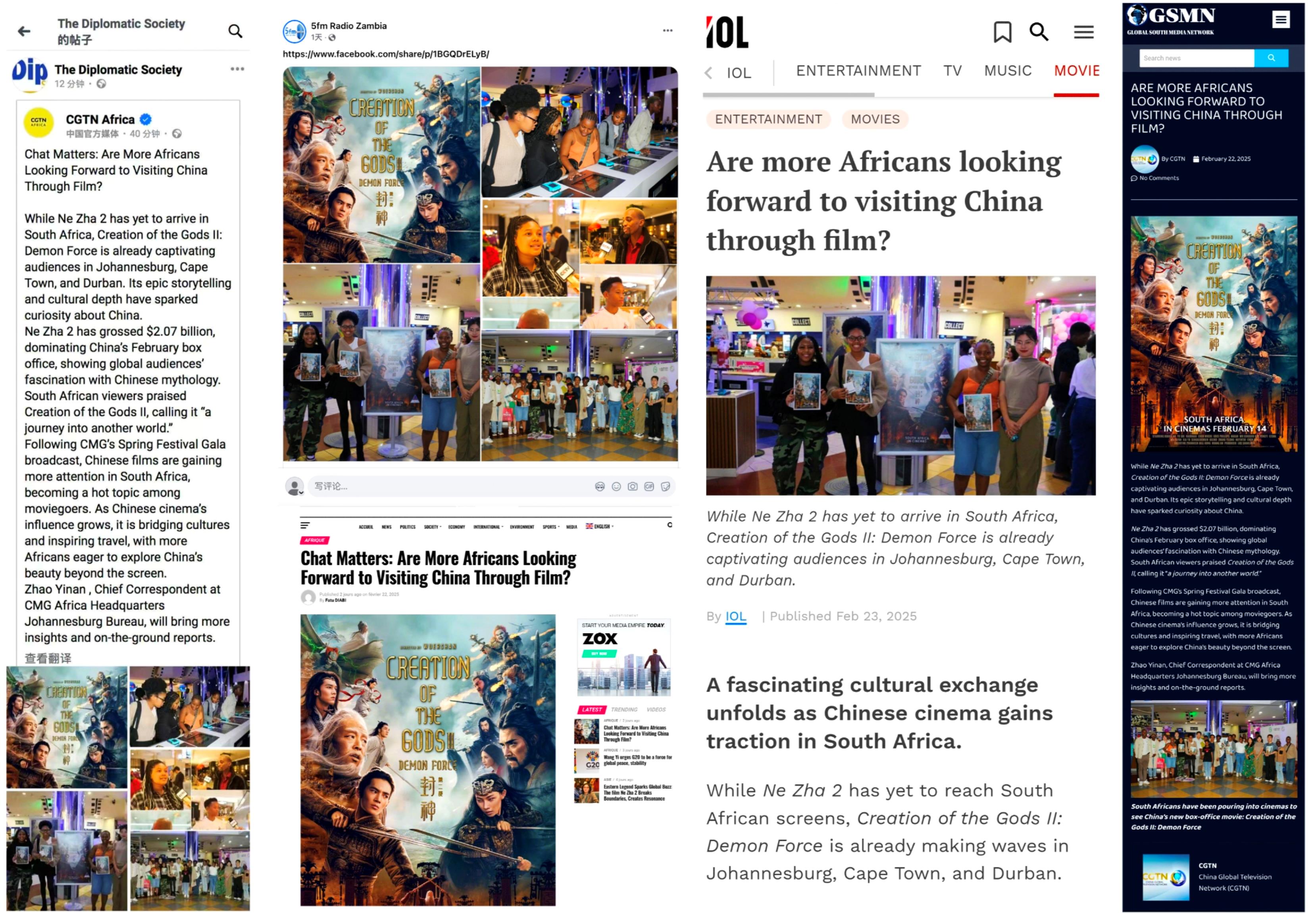 此外,中國(guó)春節(jié)檔電影登陸非洲并引發(fā)廣泛影響的相關(guān)報(bào)道被肯尼亞廣播公司、南非獨(dú)立傳媒、南非《外交圈報(bào)》、全球南方新聞網(wǎng)、贊比亞5fm電臺(tái)、津巴布韋廣播公司、岡比亞之聲、剛果新聞網(wǎng)等多家媒體轉(zhuǎn)引轉(zhuǎn)載,觸達(dá)超1億受眾。