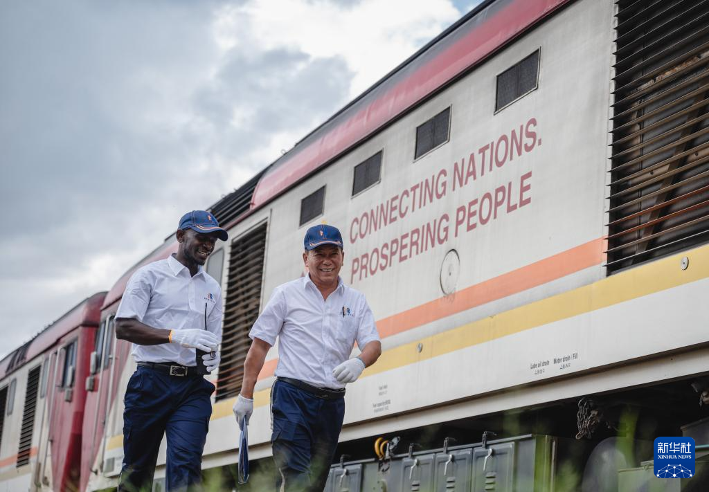 2023年5月23日,在肯尼亞內(nèi)羅畢,非洲之星鐵路運營公司機輛部的火車駕駛員蔣立平(右)與學員霍勒斯從一輛印有“連接國家 走向繁榮”標語的蒙內(nèi)鐵路機車旁走過。 新華社記者 王冠森 攝