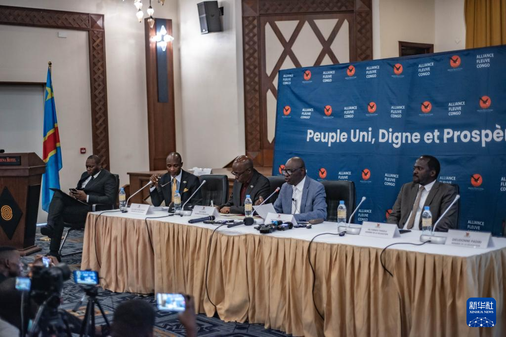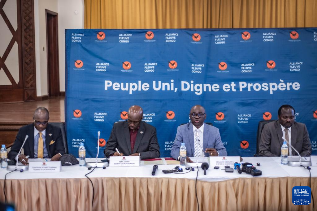 7月25日,在剛果(金)北基伍省首府戈馬市,“M23運(yùn)動(dòng)”對話代表姆博寧帕(右二)出席記者會(huì)。新華社發(fā)(扎內(nèi)姆·內(nèi)蒂·扎伊迪攝)