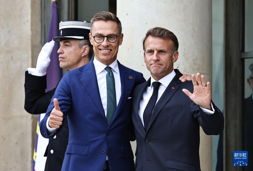 9月4日,在法國首都巴黎的總統(tǒng)府愛麗舍宮,法國總統(tǒng)馬克龍(右)迎接出席“志愿聯(lián)盟”線上會(huì)議的芬蘭總統(tǒng)斯圖布。新華社記者 高靜 攝