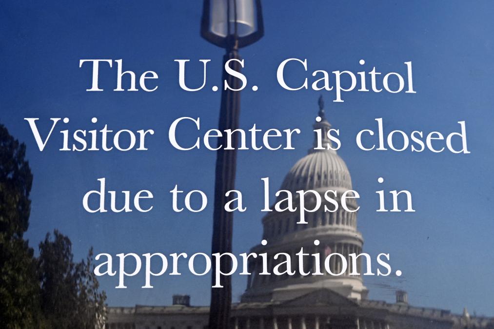 10月1日,在美國(guó)華盛頓的美國(guó)國(guó)會(huì)大廈前,公告牌顯示國(guó)會(huì)大廈游客中心關(guān)閉。新華社記者 李睿 攝