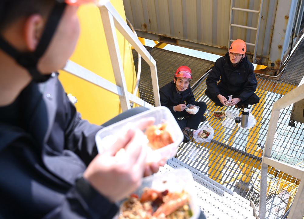 工程師們在海上風(fēng)電塔基上吃著從岸上帶來的午餐。新華社記者 林善傳 攝