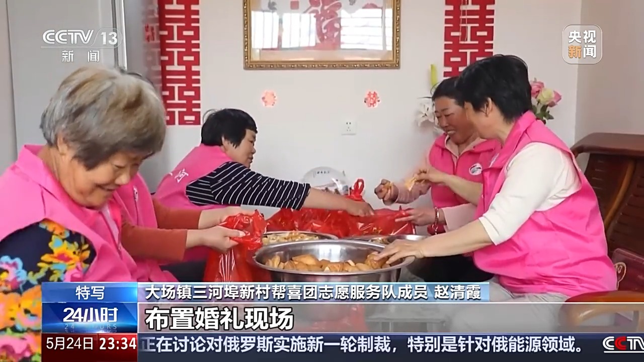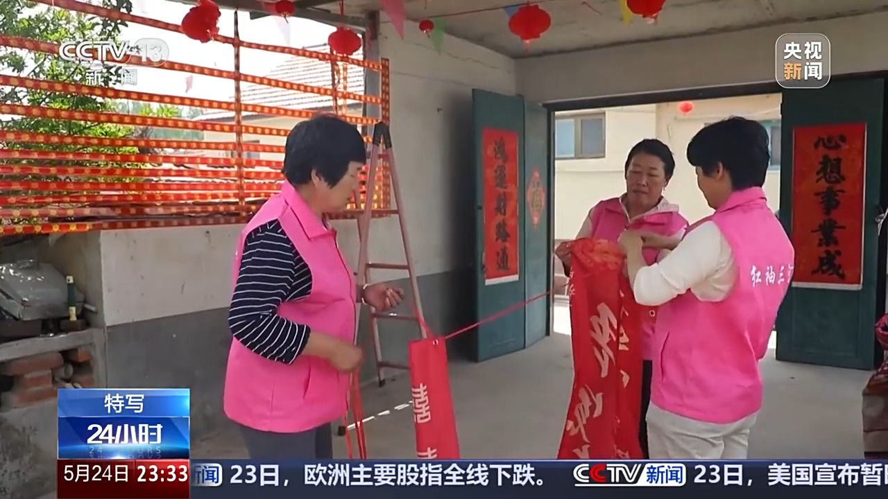 距離兒子的婚禮還有三天,三河埠村村民魏祥年家里已經(jīng)忙碌起來。陪著老魏夫婦一起忙活的,除了親友,還有好幾位穿著粉色志愿服務馬甲的大姐。