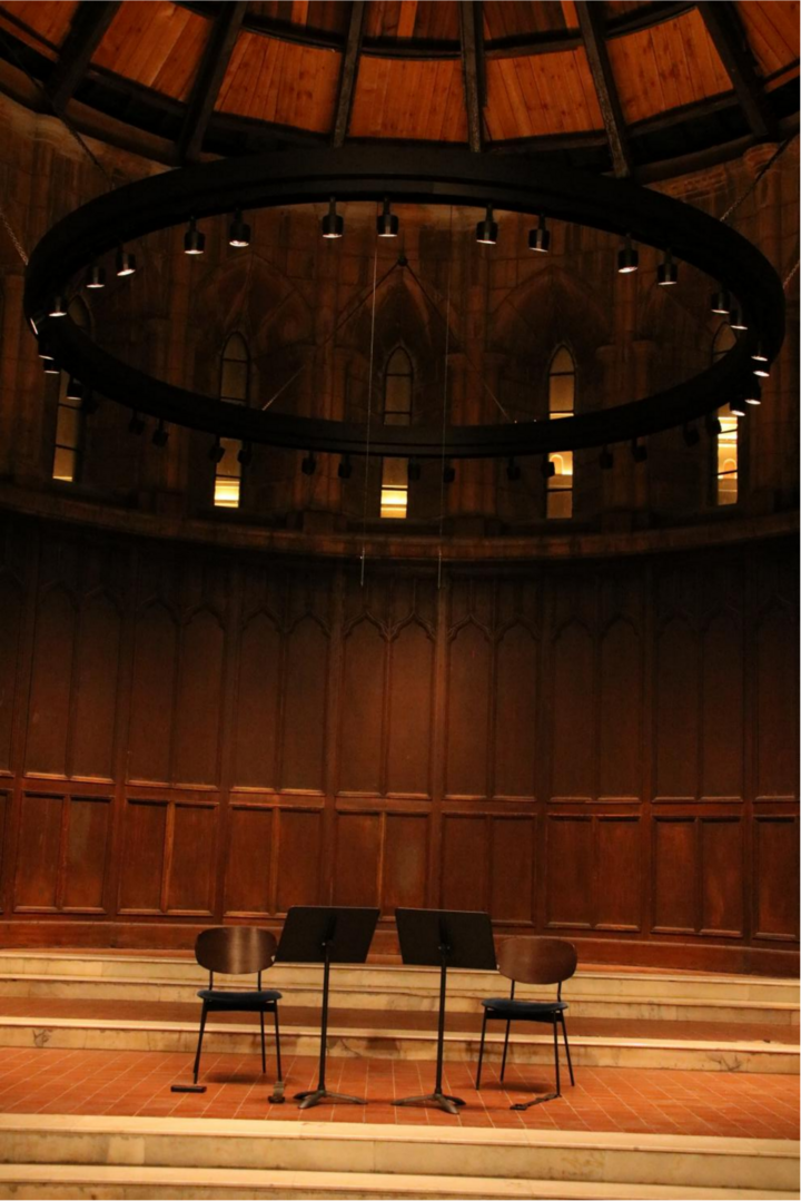 第二天晚上,我又來到安里甘藝術(shù)中心,觀看天津音樂學(xué)院師生演奏的“仲夏弦音:大提琴的沉吟與重奏”音樂會。坐在安里甘主堂倒沙漏形的穹頂下,沐浴在大提琴深情莊嚴(yán)的奏鳴中,我沉醉了。
