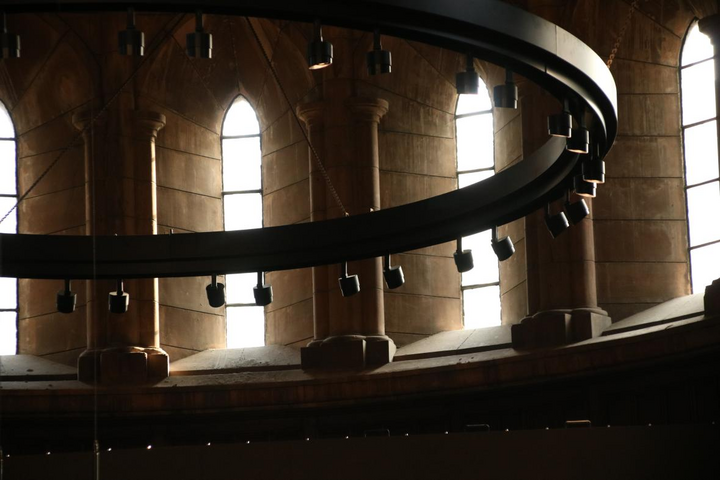 在原來祭臺的中間,現(xiàn)在改造為演講、演奏的環(huán)形中心臺。上方是一個(gè)中央環(huán)形燈,在沒亮燈之前就像一條烏黑色的緞帶,神秘且漂亮。