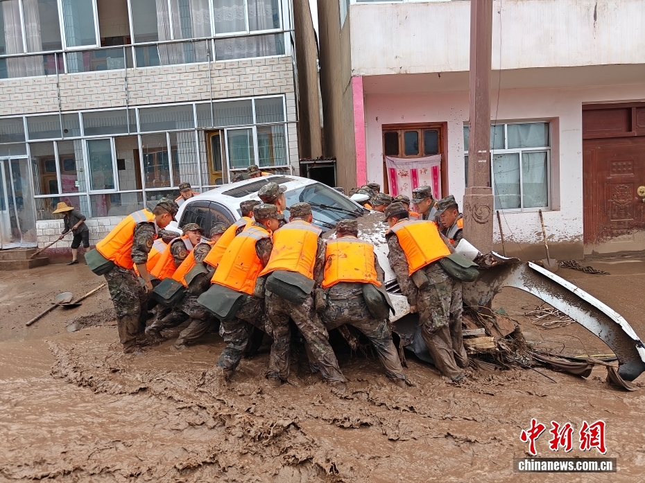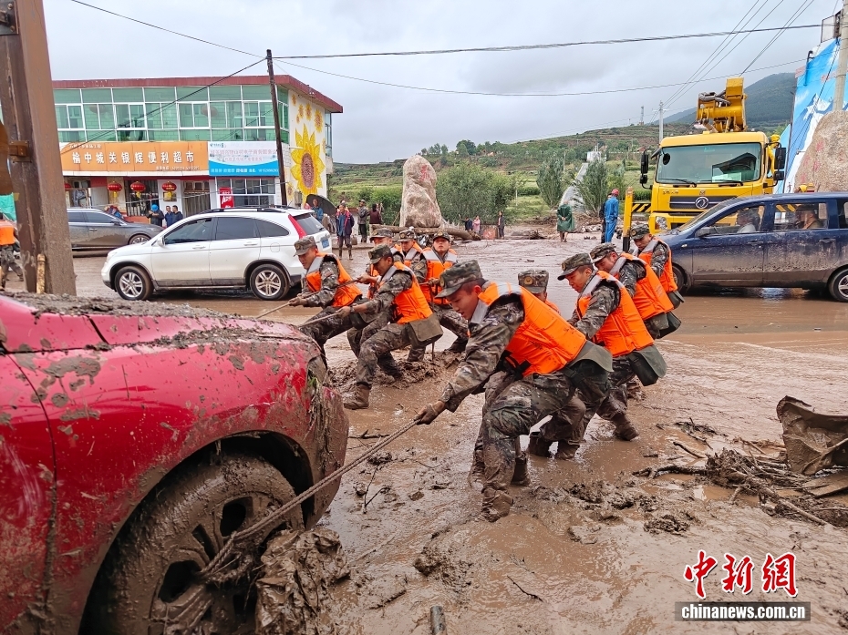 8月8日,武警甘肅總隊(duì)機(jī)動(dòng)支隊(duì)官兵在甘肅省蘭州市榆中縣興隆山村轉(zhuǎn)移損壞車輛。劉昆 攝