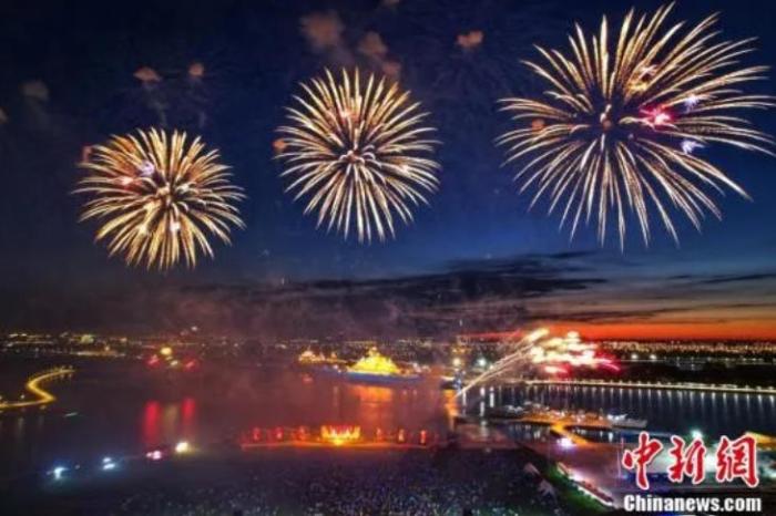 7月5日晚,“夜上津門·焰遇航母”大型沉浸式夏日音樂(lè)焰火秀在天津泰達(dá)航母主題公園上演。本次焰火秀以“煙花星球”為主題,吸引了許多市民和游客沉浸式體驗(yàn)視聽(tīng)盛宴。(無(wú)人機(jī)照片)中新社記者 佟郁 攝
