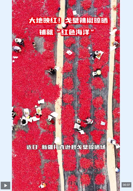近日,新疆托克遜縣戈壁晾曬場(chǎng)“變身”辣椒晾曬場(chǎng),鋪成了一片壯觀的“紅色海洋”。
