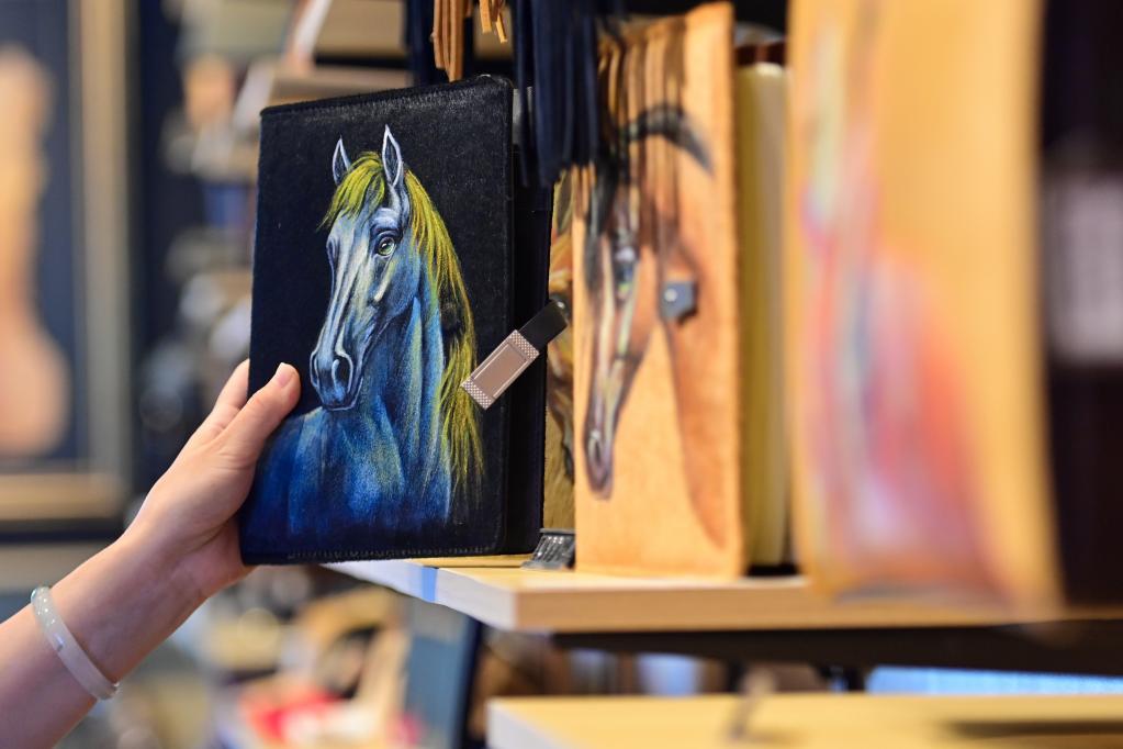 “伊犁是‘天馬之鄉(xiāng)’,我們在皮毛一體的馬皮上進(jìn)行手工繪畫,每幅圖案都是獨(dú)一無二的,讓非遺與旅游深度融合?!钡觊L茹柯耶·艾散介紹,店鋪還開發(fā)出馬毛筆記本、首飾等文創(chuàng)衍生品,深受年輕人喜愛。