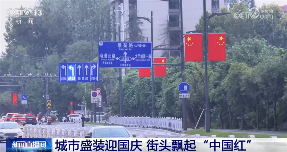 迎風(fēng)飄揚(yáng)的五星紅旗與蔥郁的街道綠樹交織,構(gòu)成了一道亮麗的風(fēng)景線。一抹抹躍動的“中國紅”扮靚了城市街景,也點燃了人們內(nèi)心深處的愛國熱情。
