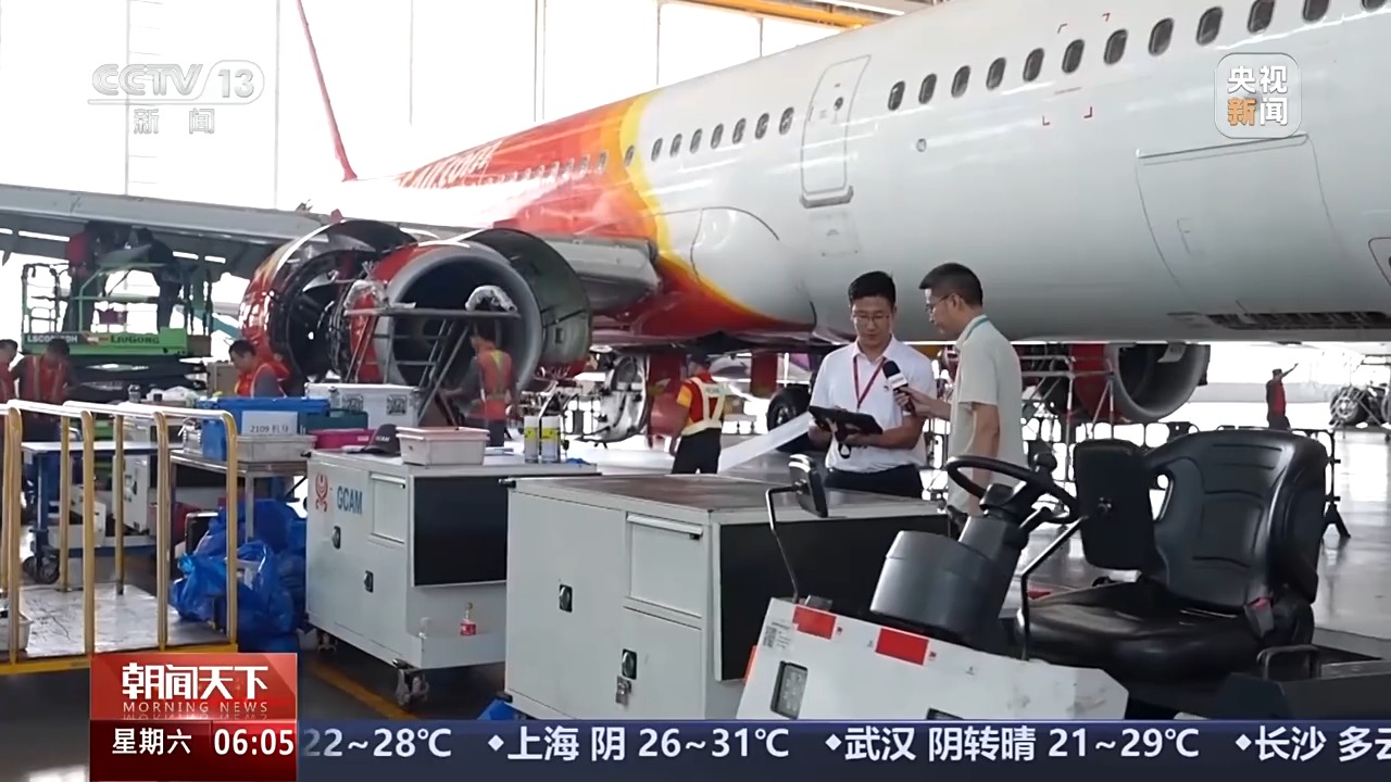一站式飛機維修產(chǎn)業(yè)基地副總監(jiān) 楊文博:我們現(xiàn)在看到的這架是來自泰國的,這里兩架越南的,機坪上也有等待進機庫進行維修的一架境外飛機。我們今年上半年的境外維修飛機的數(shù)量已經(jīng)接近于去年一年的量了?,F(xiàn)在每條線位都已經(jīng)是滿的了,一直要持續(xù)到2026年11月底。
