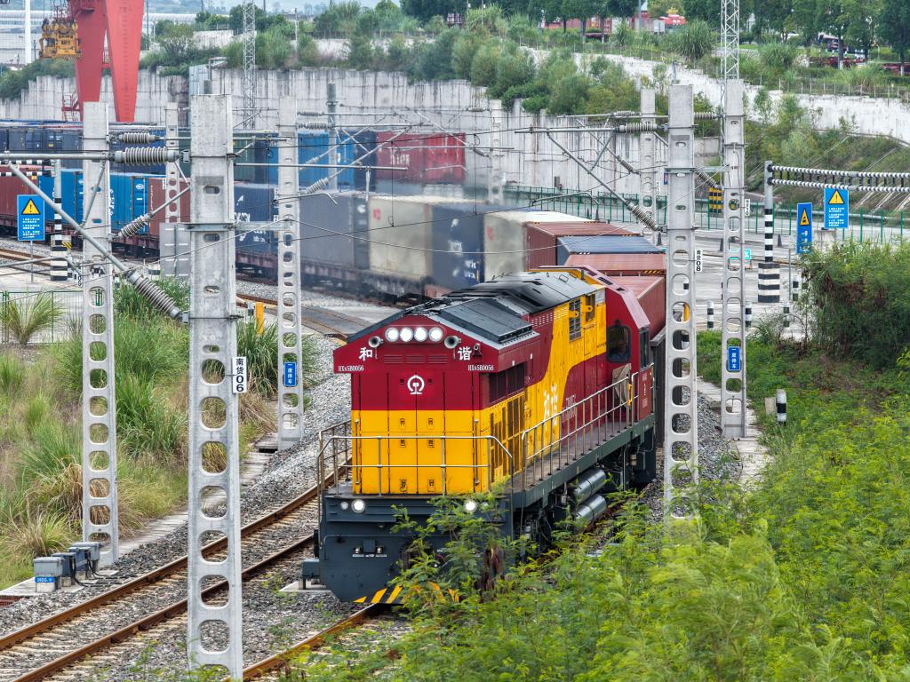 現(xiàn)場(chǎng)調(diào)度員逐一檢查集裝箱,龍門吊有條不紊地裝載貨物,班列司機(jī)認(rèn)真進(jìn)行發(fā)車前最后檢查……國(guó)慶中秋假期里的清晨,位于中國(guó)西部直轄市重慶的團(tuán)結(jié)村中心站延續(xù)著日常的喧鬧。