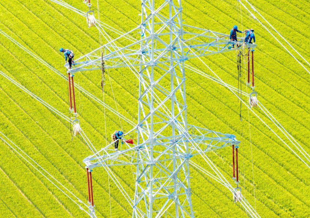 2025年5月4日,電力施工人員在江蘇省揚(yáng)州市江都區(qū)武堅(jiān)鎮(zhèn)至江蘇省興化經(jīng)濟(jì)開發(fā)區(qū)的220千伏華電武堅(jiān)25萬千瓦集中式光伏項(xiàng)目配套輸電線路上作業(yè)(無人機(jī)照片)。新華社發(fā)(任飛攝)