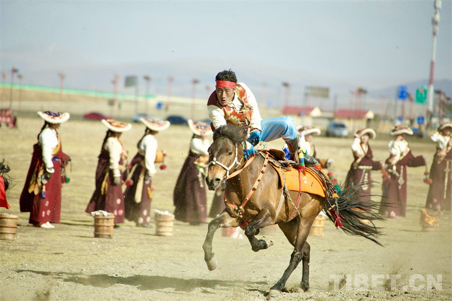 在海拔4000米左右的遼闊天地間,康巴漢子們駕馭著矯健的駿馬、身著華美的傳統(tǒng)服飾,如疾風般掠過金色的草原,在馬背上展示跑馬射箭、乘馬射擊、跑馬拾哈達、跑馬倒立、跑馬懸體等高難度動作,馬蹄聲聲、歡呼陣陣,交織成高原最豪邁的樂章。(中國西藏網(wǎng) 記者/畢然 龍真多吉)