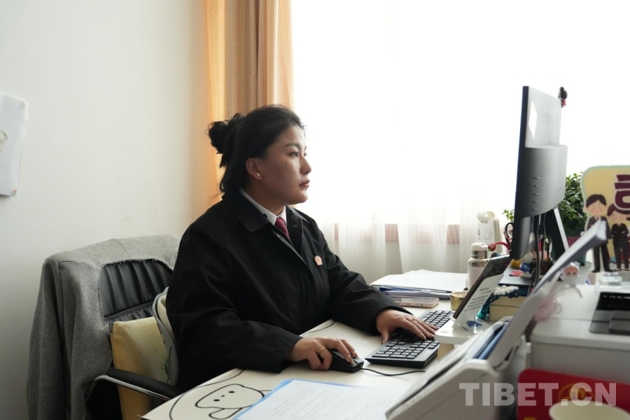 圖為正在辦公的阿里地區(qū)中級(jí)人民法院書記員尼瑪卓瑪 攝影:邊子捷