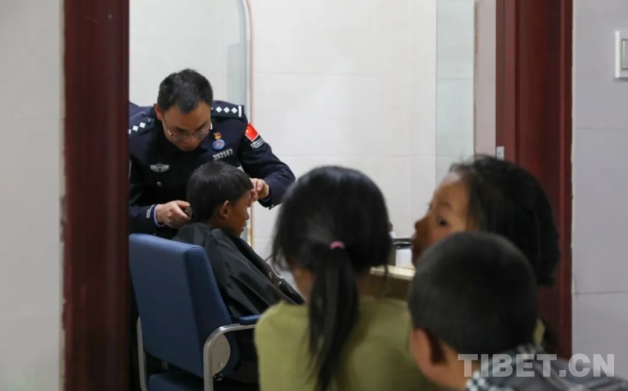 圖為民警在便民理發(fā)室為當?shù)睾⒆永戆l(fā)