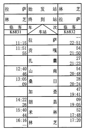 2025年7月16、18、20、21、23、25、27、28、30日、8月1、3、4、6、8、10、11、13、15、17、18、20、22、24、25、27、29、31日拉薩至林芝加開K6831/2次臨時旅客列車。