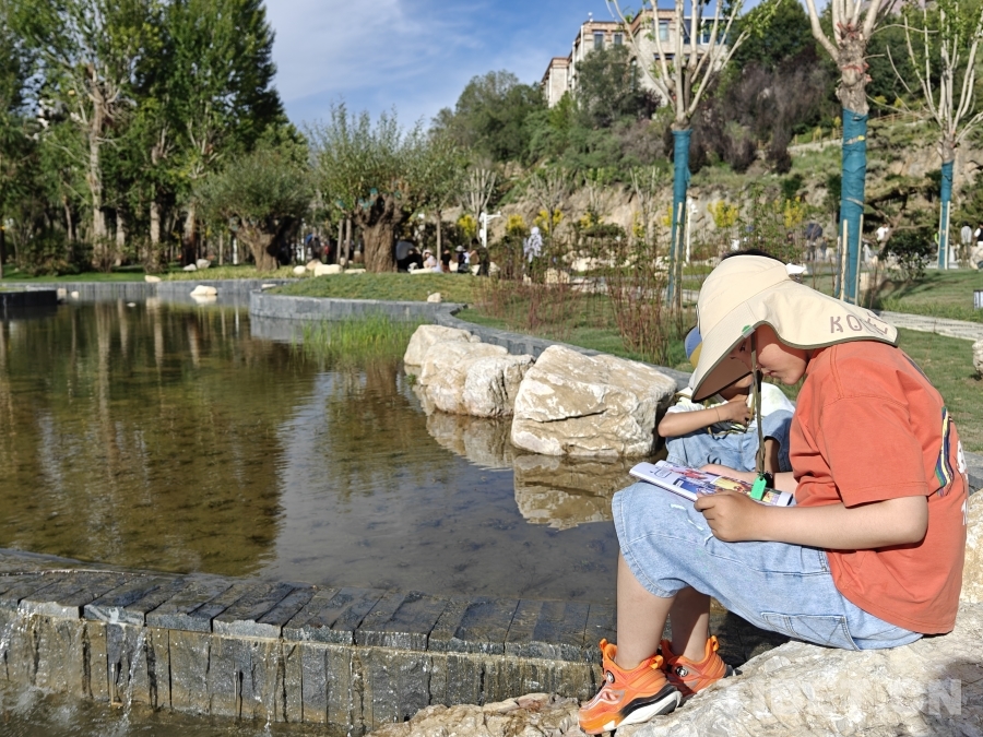圖為孩子在公園內(nèi)閱讀書(shū)籍
