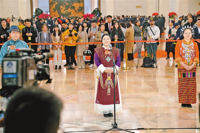 圖為住藏全國政協(xié)委員白瑪玉珍(中)在“委員通道”上介紹墨脫的發(fā)展變化。記者 旦增平措 次旦央吉 攝