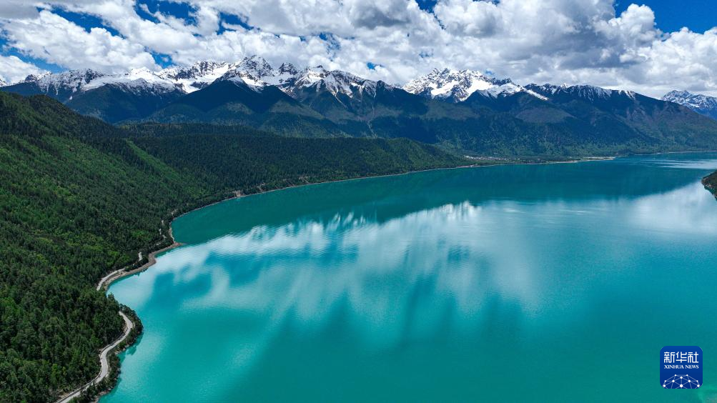 雪山環(huán)抱的巴松措(5月28日攝,無(wú)人機(jī)照片)。新華社記者 晉美多吉 攝
