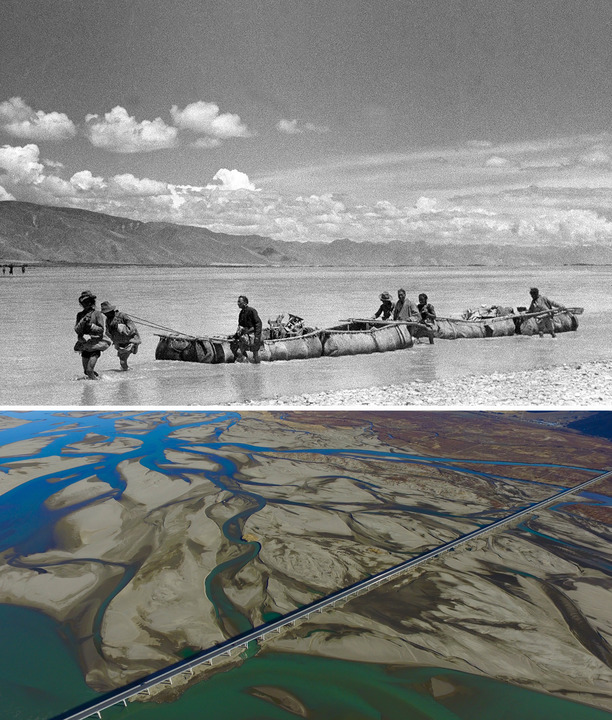 ↑拼版照片:上圖是20世紀50年代,雅魯藏布江上游的牛皮船載著土特產(chǎn)和糧食沿江運輸至西藏東部(新華社發(fā)趙奇攝);下圖是2016年12月11日拍攝的位于西藏山南市扎囊縣境內(nèi)的扎囊特大橋(新華社記者 普布扎西 攝)。