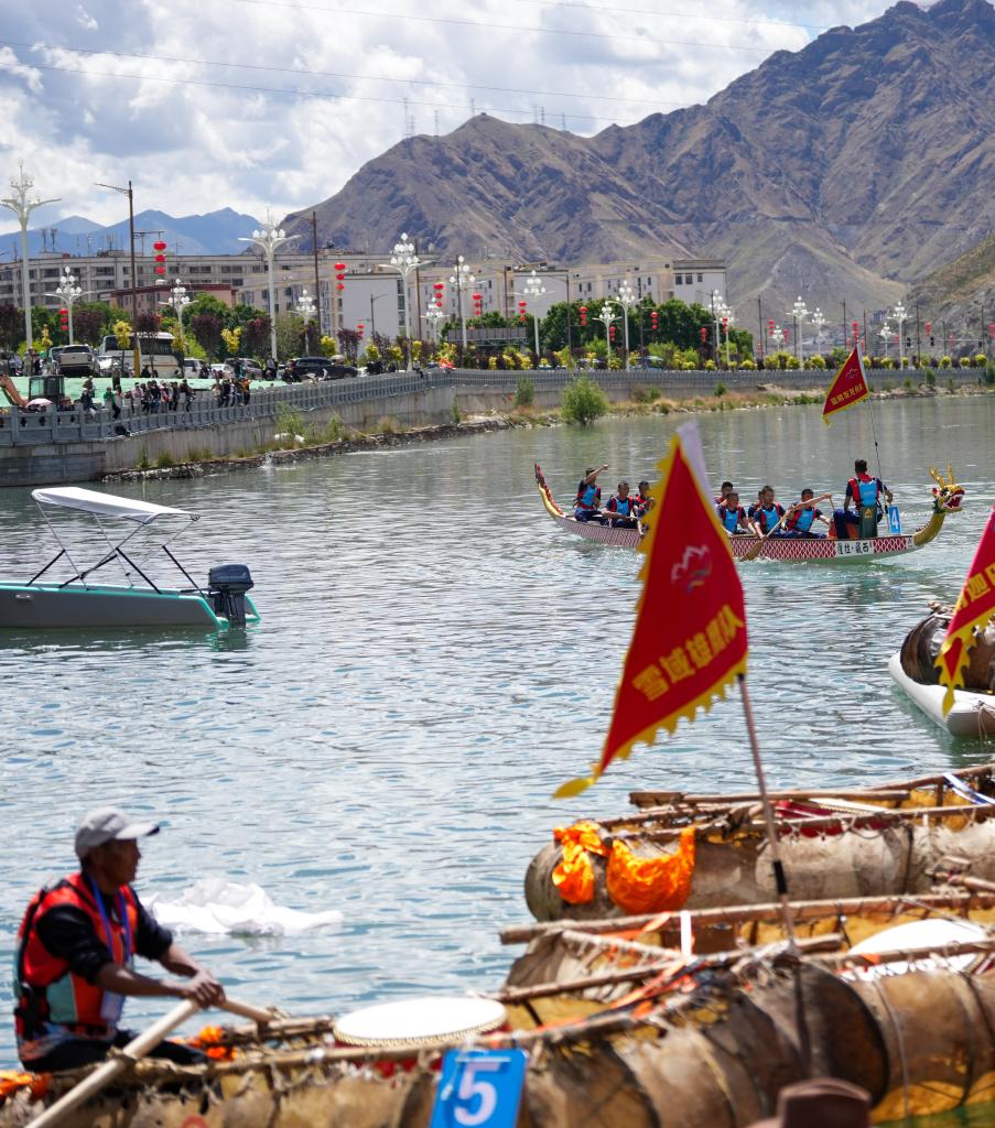 ↑5月31日,在拉薩市濱河公園旁的水域內(nèi),西藏自治區(qū)端午節(jié)牛皮船(龍舟)賽舉行。新華社記者 晉美多吉 攝