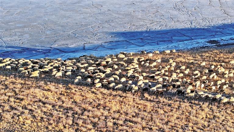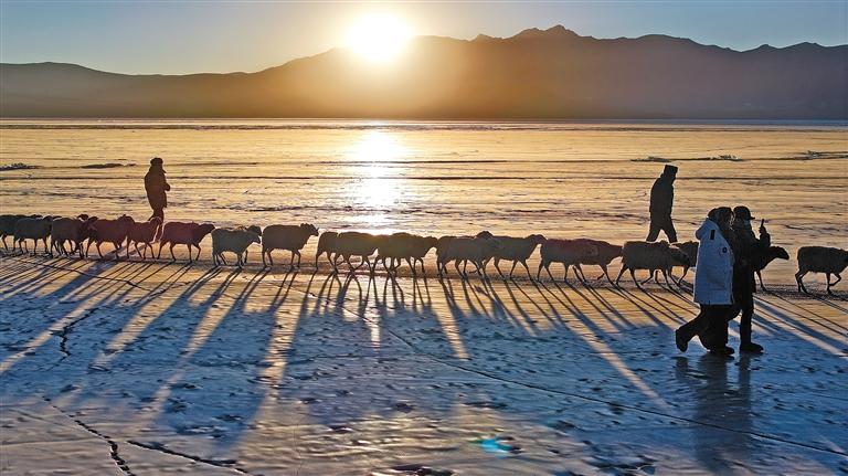 朝陽下,羊群在牧民和民警的保護下前往湖心島牧場。