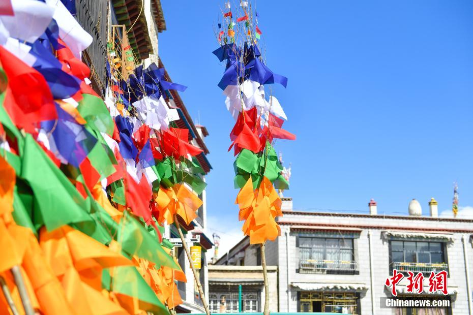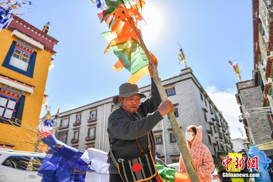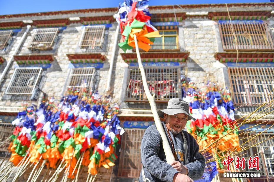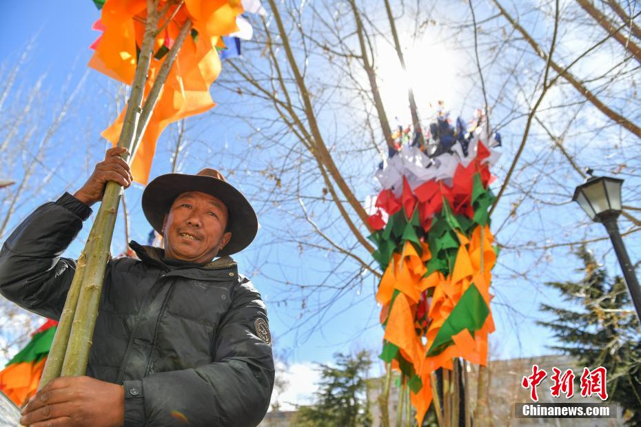 臨近藏歷新年,2月16日,在西藏拉薩街頭,農(nóng)牧民正縫制五彩經(jīng)幡樹。五彩經(jīng)幡樹是藏族民眾在藏歷新年前必備的年貨之一。藏歷新年期間,藏族民眾會(huì)選擇一個(gè)良辰吉日,為自家的房頂更換五彩經(jīng)幡樹,祈求新的一年里五谷豐登,吉祥如意。圖為2月16日,頓珠扛著五彩經(jīng)幡樹。貢確 攝