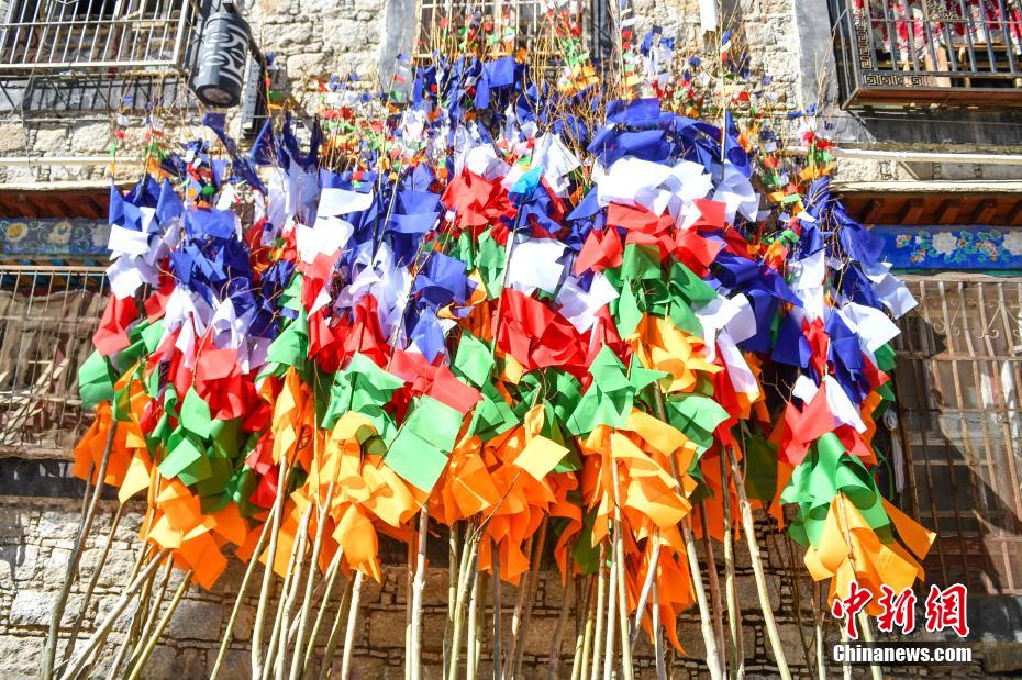 臨近藏歷新年,2月16日,在西藏拉薩街頭,農(nóng)牧民正縫制五彩經(jīng)幡樹。五彩經(jīng)幡樹是藏族民眾在藏歷新年前必備的年貨之一。藏歷新年期間,藏族民眾會(huì)選擇一個(gè)良辰吉日,為自家的房頂更換五彩經(jīng)幡樹,祈求新的一年里五谷豐登,吉祥如意。圖為2月16日,制作完成的五彩經(jīng)幡樹。貢確 攝