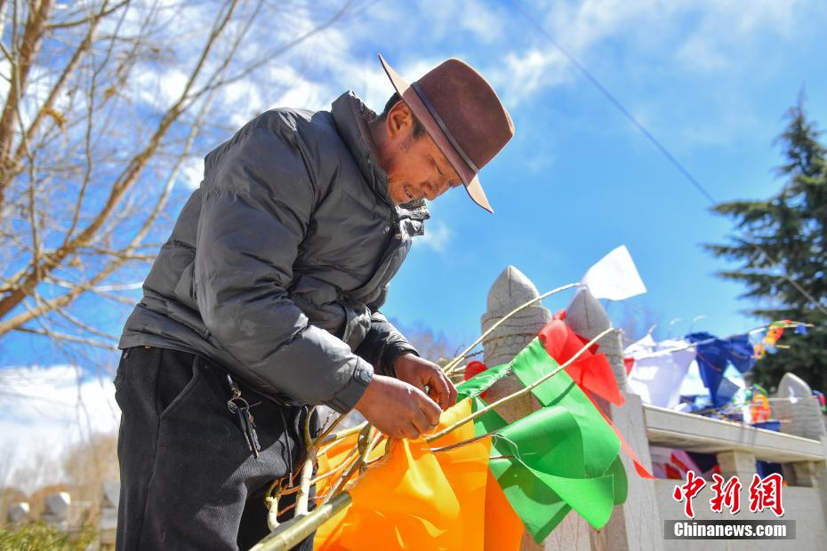 臨近藏歷新年,2月16日,在西藏拉薩街頭,農(nóng)牧民正縫制五彩經(jīng)幡樹。五彩經(jīng)幡樹是藏族民眾在藏歷新年前必備的年貨之一。藏歷新年期間,藏族民眾會(huì)選擇一個(gè)良辰吉日,為自家的房頂更換五彩經(jīng)幡樹,祈求新的一年里五谷豐登,吉祥如意。圖為2月16日,頓珠正在縫制五彩經(jīng)幡樹。貢確 攝