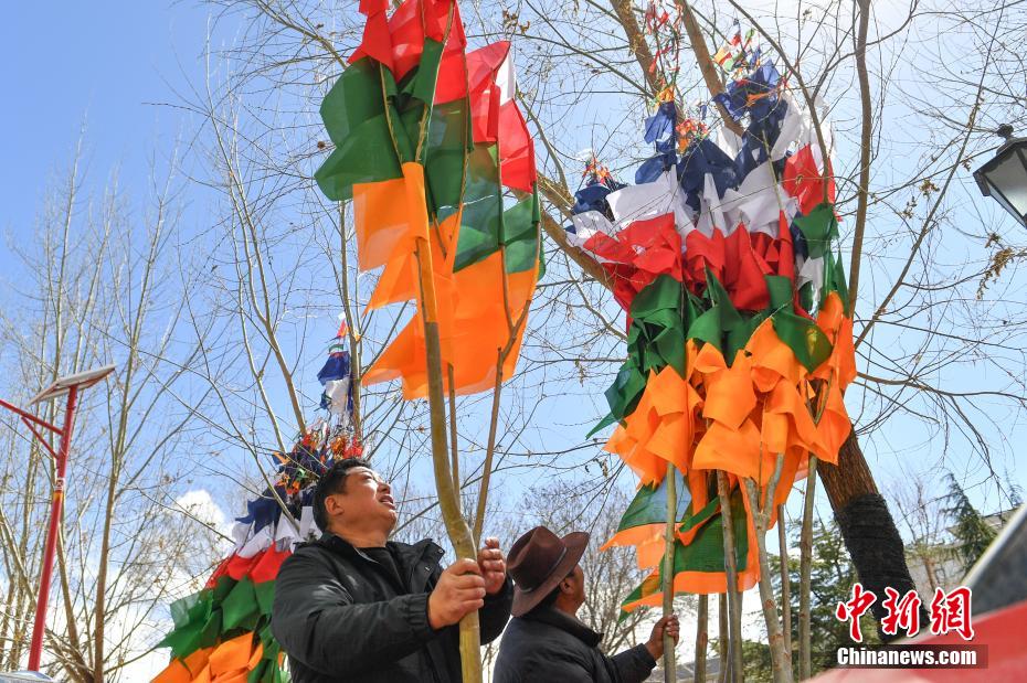臨近藏歷新年,2月16日,在西藏拉薩街頭,農(nóng)牧民正縫制五彩經(jīng)幡樹。五彩經(jīng)幡樹是藏族民眾在藏歷新年前必備的年貨之一。藏歷新年期間,藏族民眾會(huì)選擇一個(gè)良辰吉日,為自家的房頂更換五彩經(jīng)幡樹,祈求新的一年里五谷豐登,吉祥如意。圖為2月16日,拉薩市民正在挑選購(gòu)買五彩經(jīng)幡樹。貢確 攝