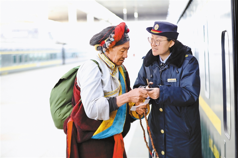 圖為列車工作人員為旅客提供乘車引導服務(wù)。記者 史金茹 攝