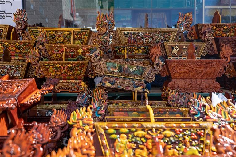 “老板,這個(gè)切瑪盒多少錢?便宜點(diǎn)我就拿走了?!薄斑@個(gè)圖案樣式都是精心雕刻的,最低1300元,實(shí)在不能再少了?!贝稳实牡赇伹?,不少顧客正在挑選“切瑪盒”,生意很是火爆?!扒鞋敽小笔菍⒕贫沸文竞杏酶舭宸珠_(kāi),左右兩邊分別盛入炒青稞和糌粑,再插上象征五谷豐登的“羅薩梅朵”和寓意吉祥的酥油花,寓意人壽年豐、吉祥如意,是藏歷新年家家戶戶必備的年貨之一。次仁告訴記者,“切瑪盒”根據(jù)圖案、顏料、大小、木材等因素,售價(jià)從幾百元到上千元不等,很多顧客普遍喜愛(ài)傳統(tǒng)樣式與圖案。