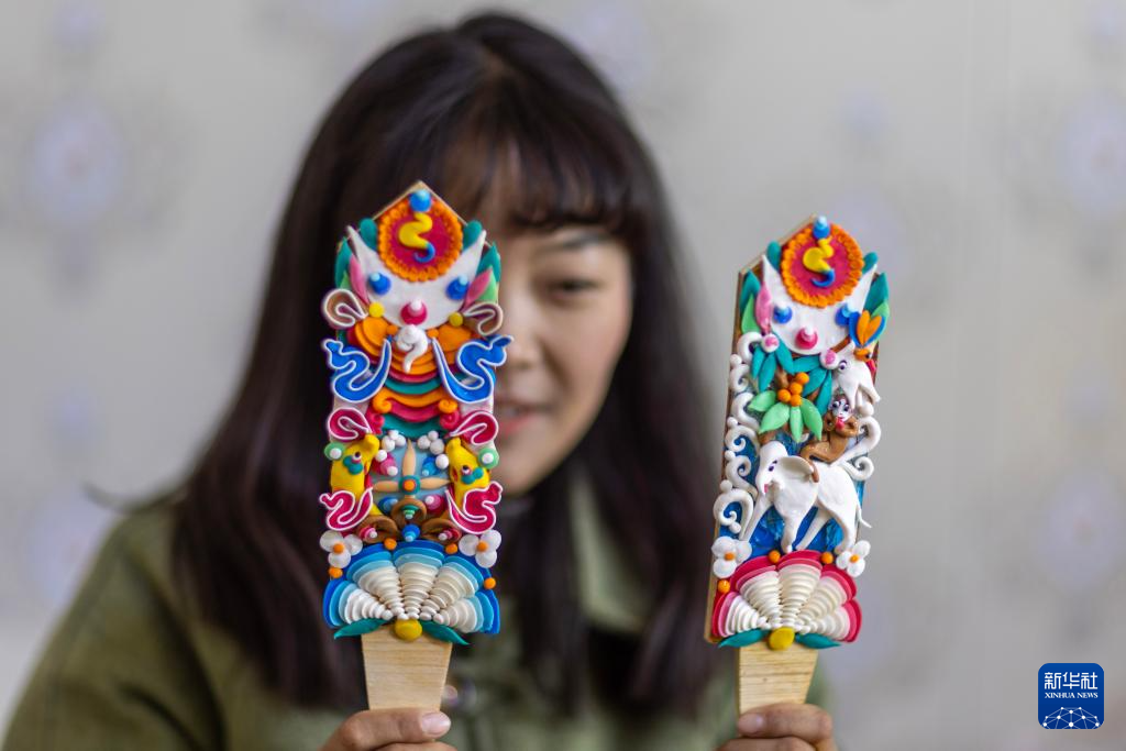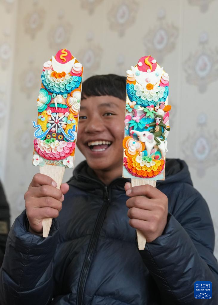 在拉薩市老城區(qū),小學(xué)徒在展示剛剛做好的一對(duì)酥油花(2月25日攝)。新華社記者 晉美多吉 攝?