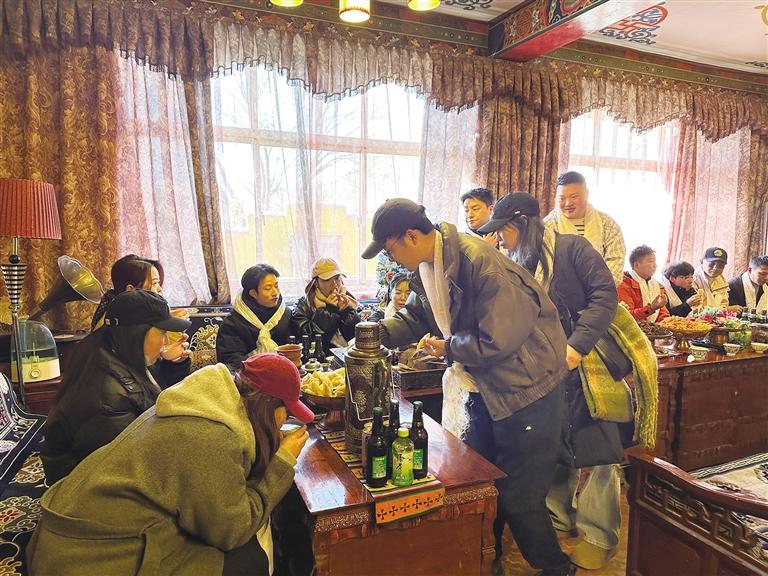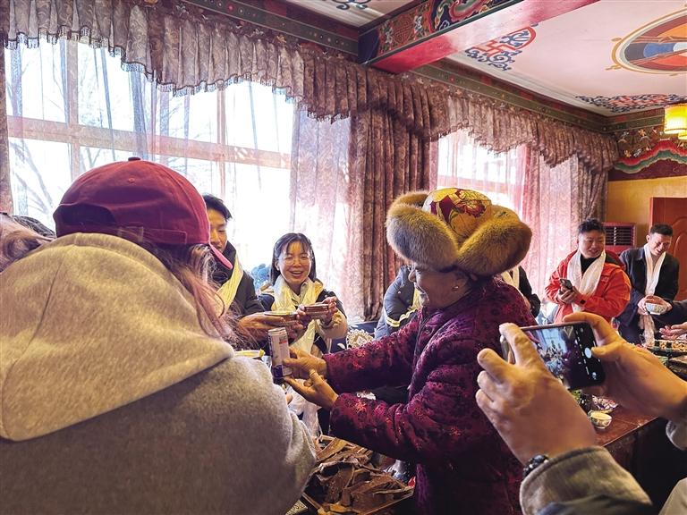 來自東北遼寧的于先生是第一次過藏歷新年,一切都讓他感到新奇不已。他一邊不停地拍照,分享給遠方的家人,一邊興奮地介紹說:“我不僅品嘗到了美味的藏式佳肴,更深入了解了藏歷新年習俗,這份跨越文化的溫暖與情誼,將成為我記憶中最珍貴的新年禮物,希望明年還有機會過藏歷新年。”于先生的話語,道出了許多游客的心聲。在這個特別的新年里,他們收獲的不僅僅是美食與美景,更是一份深厚的文化體驗和溫暖的情誼。