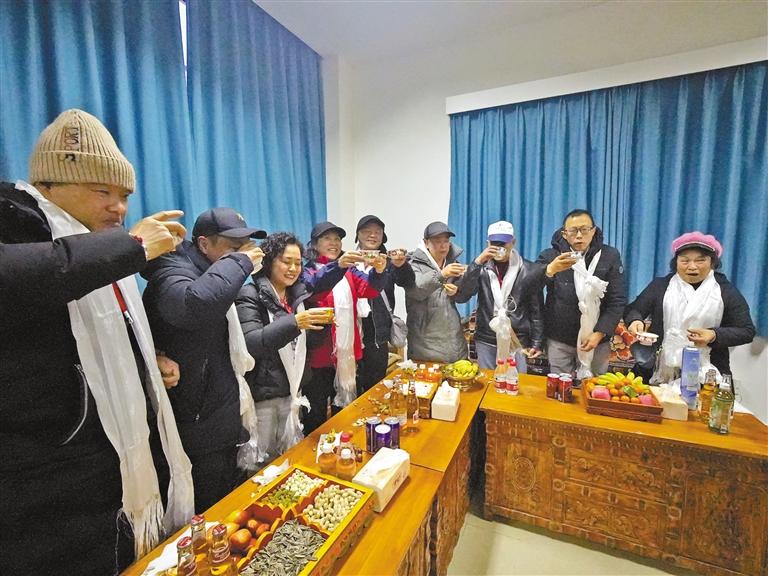 “古突”之夜,“走進(jìn)雪域邊陲 體驗(yàn)藏歷新年”旅游團(tuán)游客在玉麥以酥油茶代酒,祝賀藏歷新年,祝福祖國(guó)繁榮昌盛。