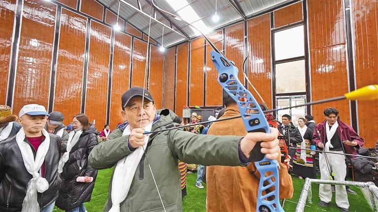 游客在扎日鎮(zhèn)體驗(yàn)當(dāng)?shù)貍鹘y(tǒng)體育項(xiàng)目——響箭?! ?/p>