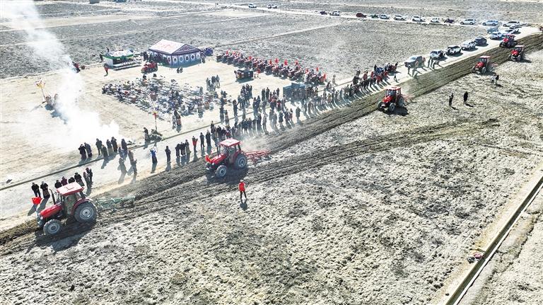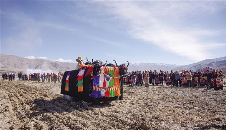 裝飾華美犄角掛飾的“機械牦?!薄侠瓩C緩緩駛入田疇,在沉睡了一冬的凍土上犁出第一道深褐色溝壑。這一具有特殊意義的儀式過后,機械的轟鳴聲響徹田野,嶄新的犁地機、播種機閃亮登場。鋼鐵履帶滾滾向前,所到之處,土地被高效翻整;播種機精準播撒,黑色的青稞種子顆顆入土。