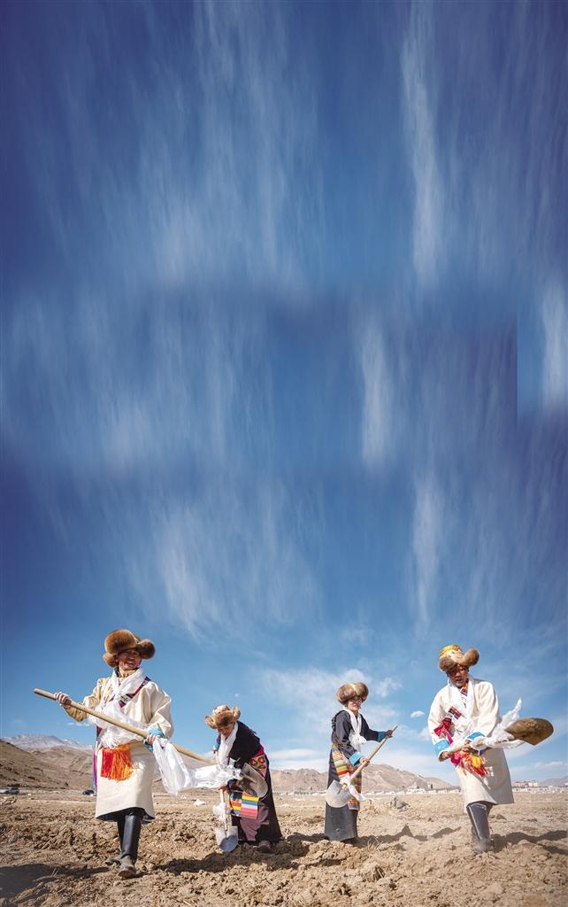 切瑪、德卡、黑青稞酒……現(xiàn)場布置隆重且有儀式感,男女村民整齊列隊,各站一排,男性村民手里抓著一把糌粑,嘴里念著祈愿詞,向著澄澈蒼穹奮力揚起,糌粑碎屑紛紛揚揚,似霰雪紛飛;緊接著,村里的婦女們手牽著手,站在田埂上唱響祝歌,回蕩在田間地頭的歌聲是對豐收的祈愿。
