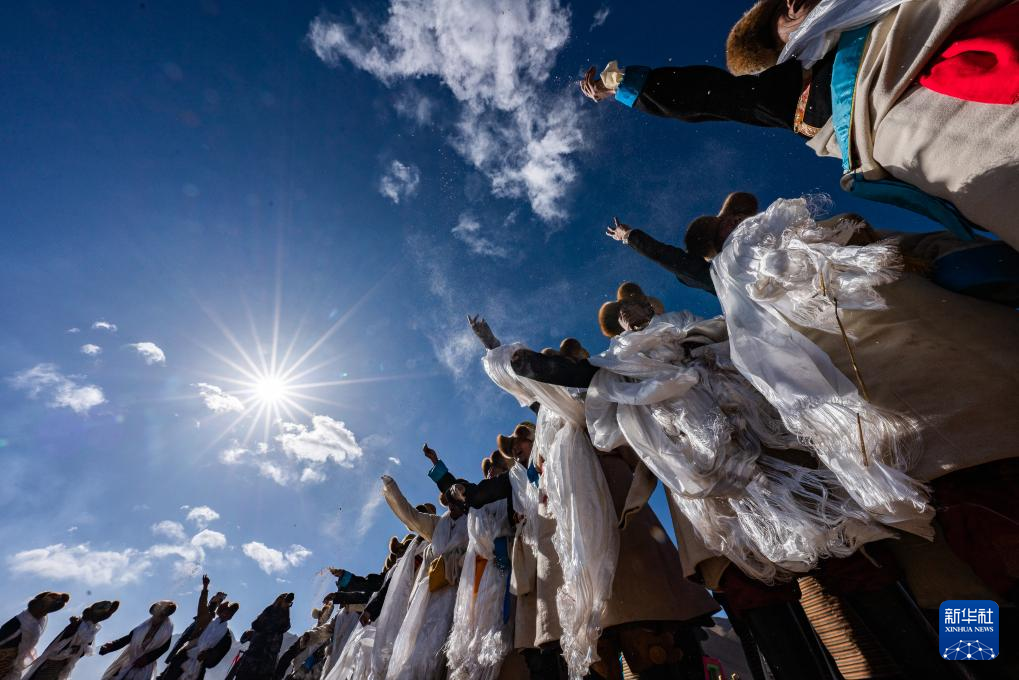 3月16日,在拉薩市林周縣春堆鄉(xiāng)春耕典禮現(xiàn)場,農(nóng)機駕駛員向天空撒糌粑祈愿豐收。新華社記者 丁增尼達(dá) 攝