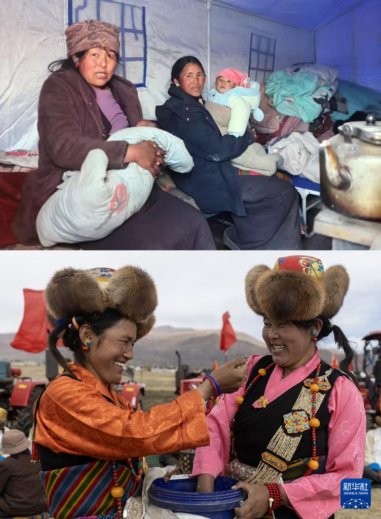 拼版照片:上圖為西藏日喀則市定日縣發(fā)生6.8級地震后,拉孜縣曲下鎮(zhèn)土林村受災(zāi)群眾丹珍卓瑪(右)和吉拉在臨時搭建的救災(zāi)帳篷中(1月7日攝);下圖為3月16日,拉孜縣曲下鎮(zhèn)土林村村民丹珍卓瑪(左)和吉拉在春耕典禮上檢查青稞種子。新華社記者 姜帆 攝