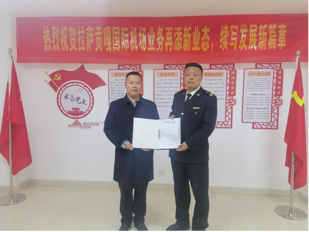 3日,拉薩海關(guān)負(fù)責(zé)人向西藏機(jī)場集團(tuán)貨運(yùn)部負(fù)責(zé)人頒發(fā)海關(guān)監(jiān)管貨物倉儲企業(yè)注冊登記證書。(拉薩海關(guān)供圖)