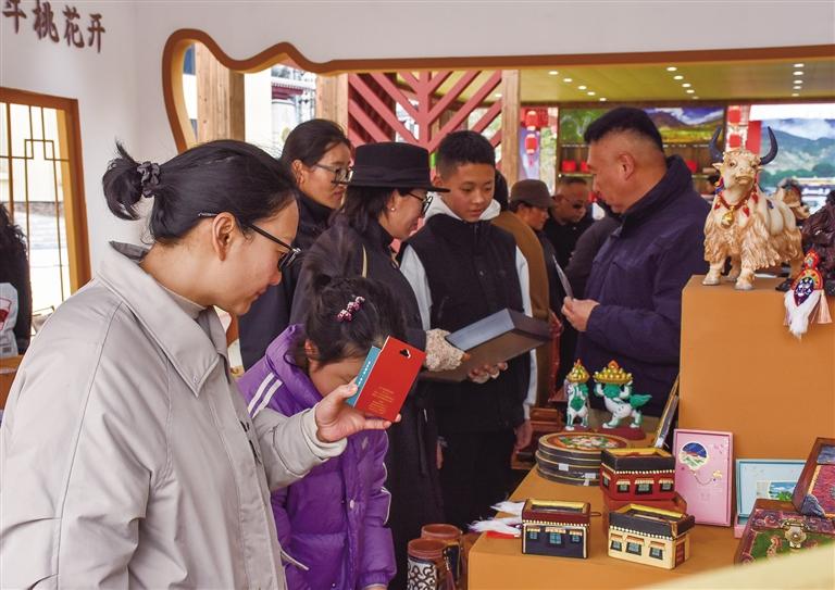 游客和市民群眾在文創(chuàng)產(chǎn)品展銷區(qū)參觀、選購特色產(chǎn)品。